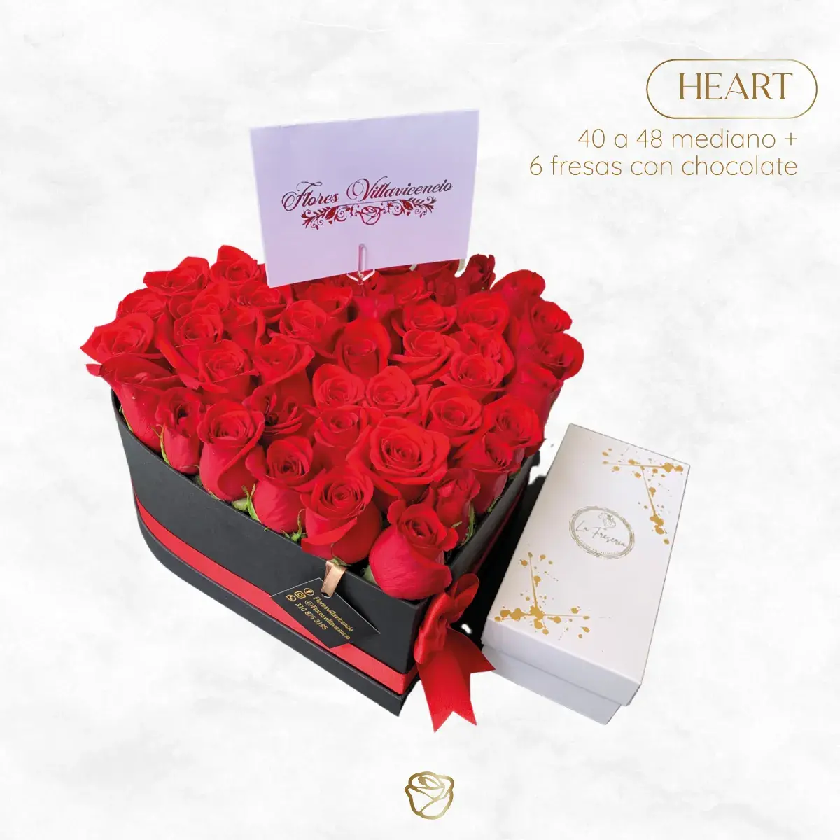 Caja Corazón de Rosas Mediano | 40 a 48 Unidades | 6 Fresas con Chocolate | Flores Villavicencio