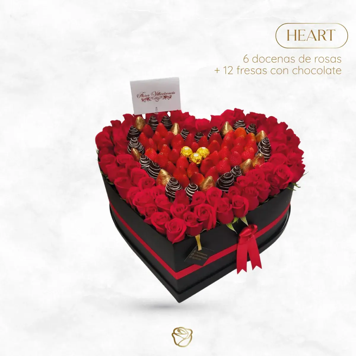 Caja Corazón de Rosas Grande | 6 Docenas | 12 Fresas con Chocolate | Flores Villavicencio